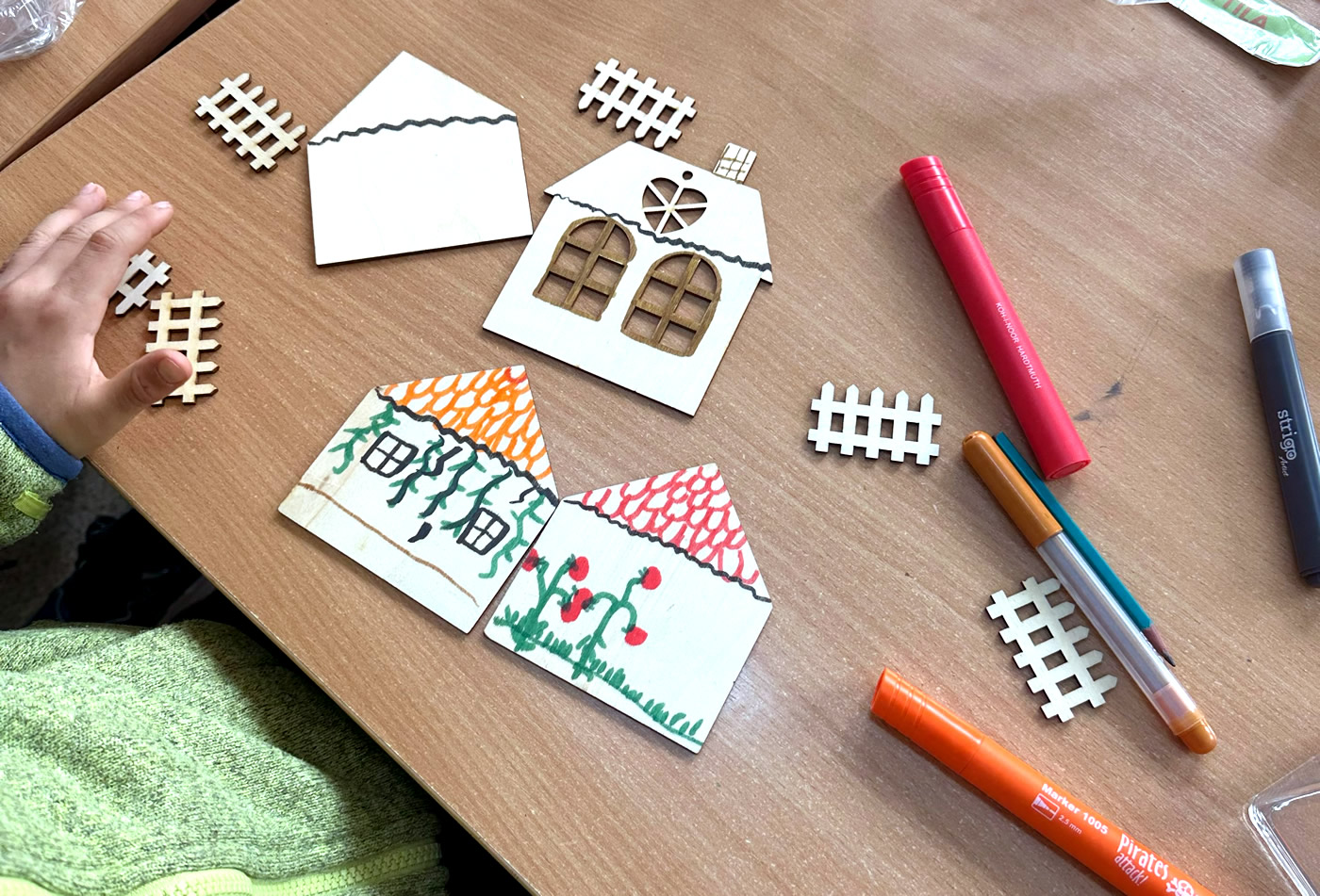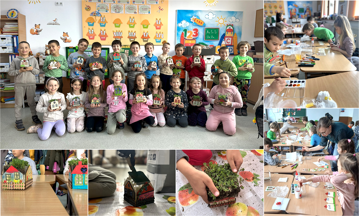Anschließend ging es an den kreativen Teil: Die Kinder untersuchten die Schichten eines extensiven Gründachs und ließen ihrer Fantasie freien Lauf. Mit fleißigen Händen und begeisterten Augen bauten sie Miniaturmodelle von Gewächshäusern. Jedes Kind gestaltete ein Fantasiehaus, bemalte es und dekorierte es mit Fenstern, Pflanzen und Blumen – so fröhlich und farbenfroh wie möglich. Wir befüllten die Häuser mit speziellem Substrat für extensives Gründach und legten eine lebende Matte aus Sedum darauf. Das Ergebnis? Jedes Kind ging mit einem lebenden Gewächshaus nach Hause, um das es sich bis zur vierten Klasse mit Sorgfalt und Liebe kümmern wird. Dann treffen wir uns wieder und beobachten gemeinsam, wie es gewachsen ist und sich entwickelt hat.