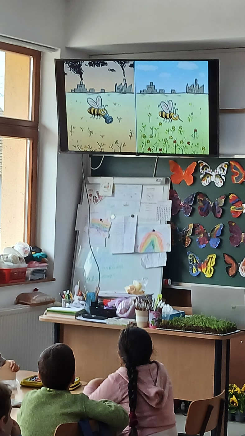 Im Rahmen der Vorbereitungsstunde begannen wir mit einer kleinen interaktiven Präsentation. Darin sprachen wir über die Unterschiede zwischen natürlicher und städtischer Umwelt, die Bedeutung gesunder Ökosysteme und die Notwendigkeit, Städte zu begrünen. Wir erklärten den Kindern, warum Bestäuber – wie Bienen oder Schmetterlinge – für das natürliche Gleichgewicht unerlässlich sind und warum es so wichtig ist, ihnen in Städten Nahrung und Schutz zu bieten. Wir diskutierten über die kühlende Wirkung von Pflanzen und wie Vegetation zur Regulierung der städtischen Temperaturen und zum Regenwassermanagement beiträgt. Gemeinsam verfolgten wir den Wasserkreislauf in der Natur und verstanden, warum wir mit dieser wertvollen Ressource umgehen müssen.