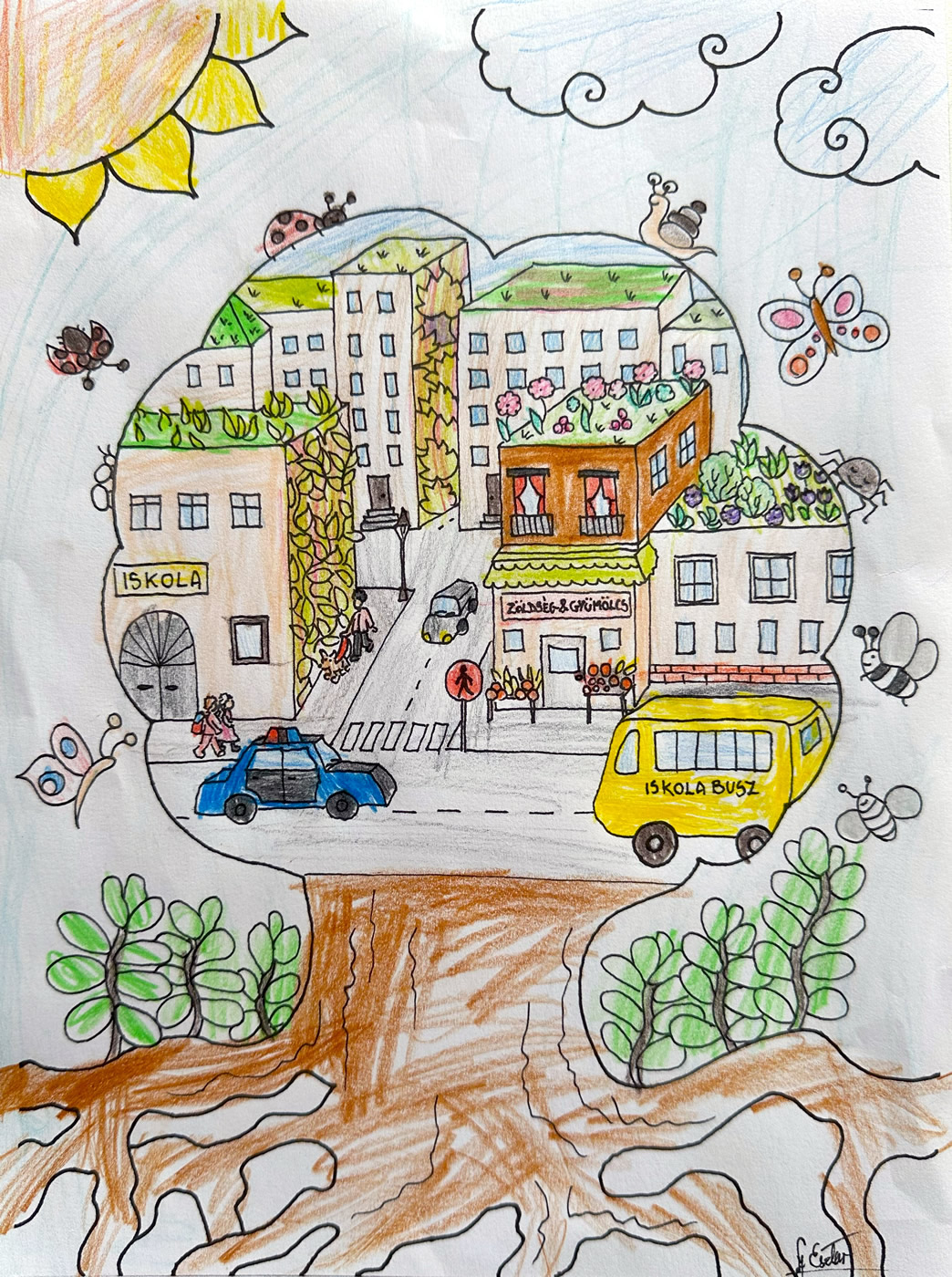 Zum Abschluss erhielt jedes Kind eine faszinierende Malvorlage – eine detaillierte Stadtszene. Es galt, alle zwischen den Gebäuden versteckten grünen Dächer und Wände zu identifizieren und sie so grün und leuchtend wie möglich auszumalen. Dadurch können die Kinder ihre Beobachtungsgabe üben und verstehen, dass Grün auch an den unerwartetsten Stellen in der Stadt zu finden ist.